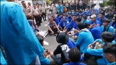 Reratusan mahasiswa Universitas Samudra Langsa , menggelar aksi demonstrasi di Kantor DPRK Langsa, terkait polemik internal antara sesama anggota DPRK Langsa, Senin (24/02/2025).