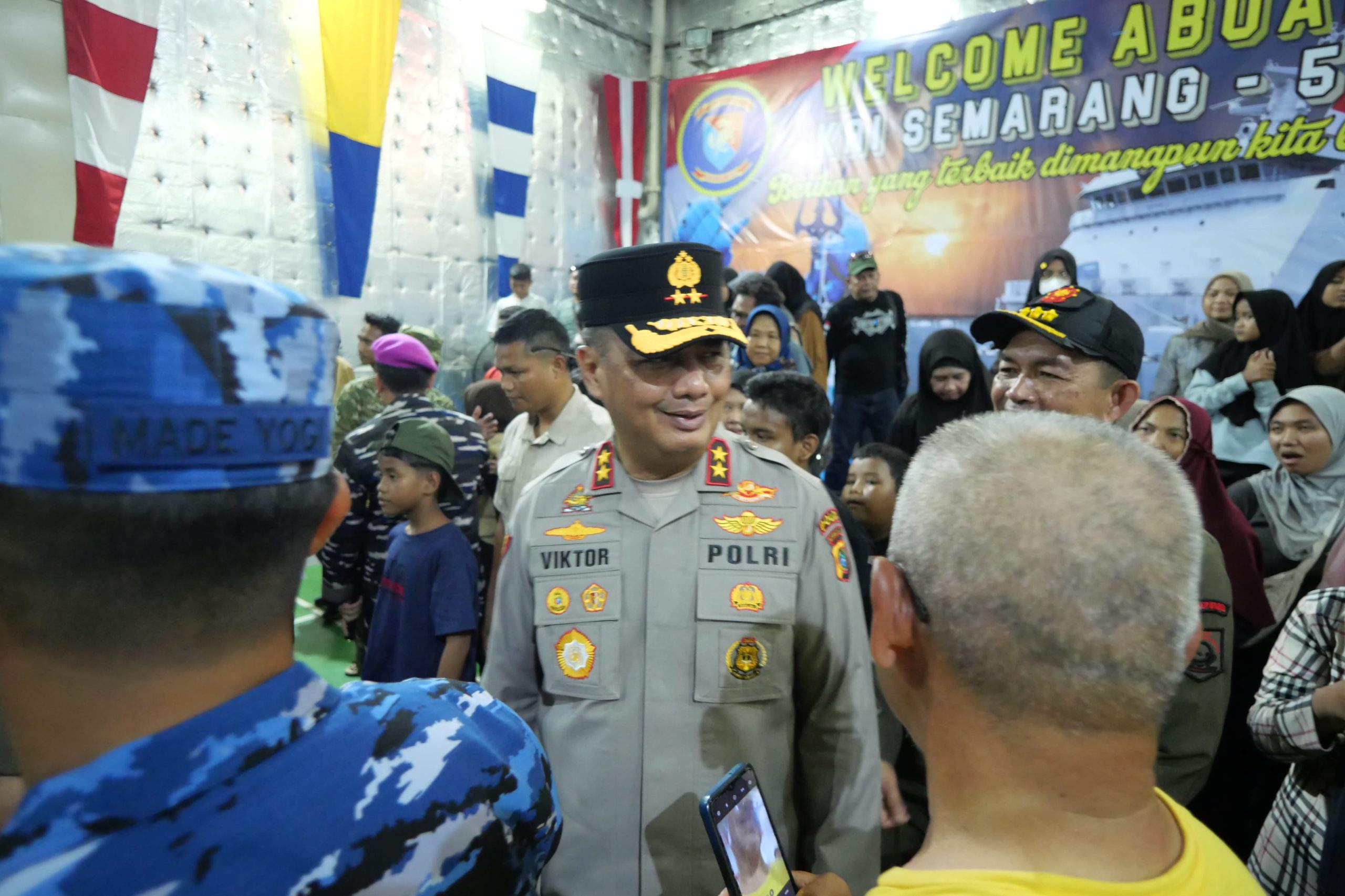 Kapolda Bangka Belitung Irjen Pol Viktor T. Sihombing menghadiri pelepasan keberangkatan mudik gratis Lebaran 2026 menggunakan kapal perang TNI AL, KRI Semarang, Jumat (27/3/26). Pelepasan dilakukan secara resmi oleh Gubernur Babel Hidayat Arsani.