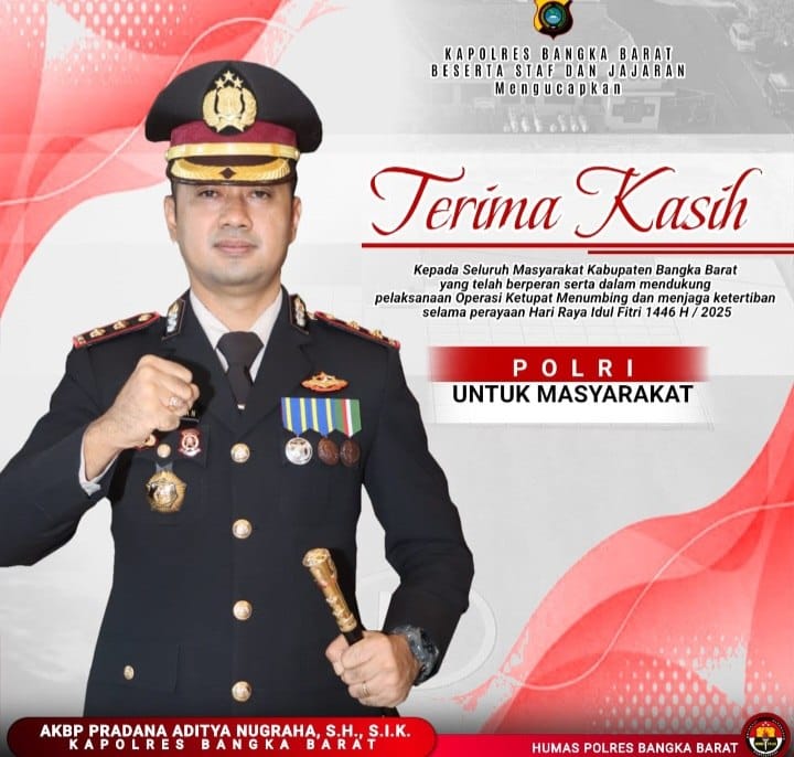 Dalam upaya menjaga keamanan dan ketertiban selama perayaan Idul Fitri 1446 Hijriyah, Kapolres Bangka Barat, AKBP Pradana Aditya Nugraha, SH, SIK, mengucapkan terima kasih yang sebesar-besarnya kepada seluruh lapisan masyarakat Kabupaten Bangka Barat. 9 April 2025