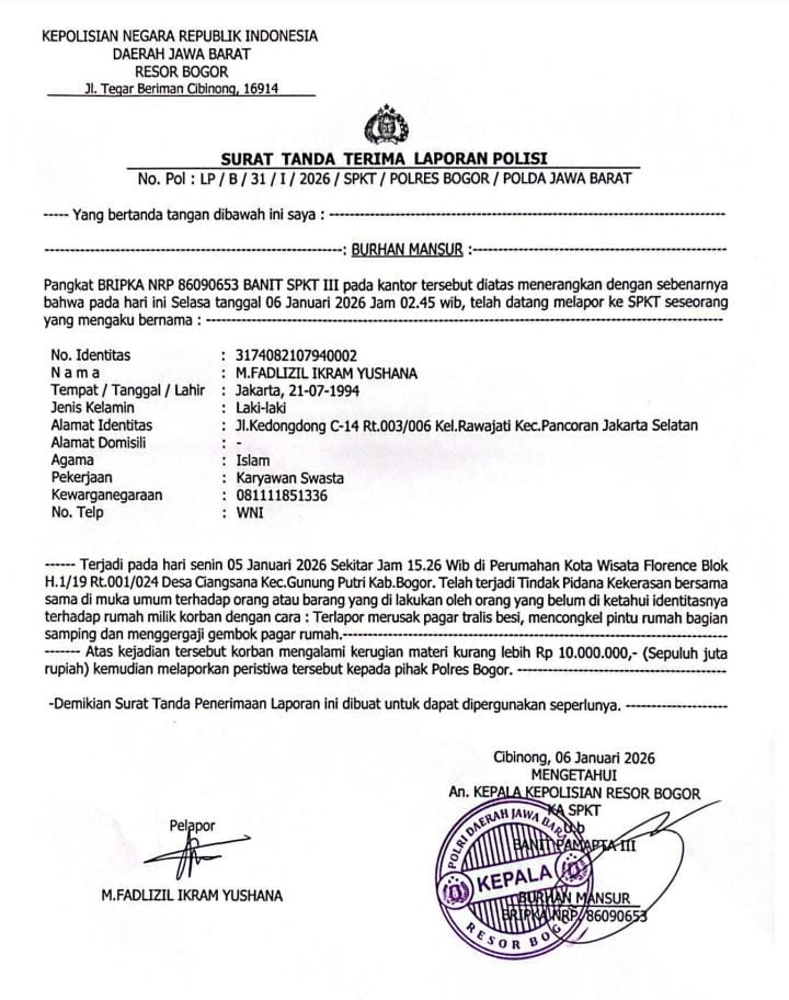 Berdasarkan dokumen Surat Tanda Terima Laporan Polisi (STTLP) dengan nomor: LP/B/31/I/2026/SPKT/Polres Bogor/Polda Jawa Barat, tertanggal 6 Januari 2026, dilaporkan adanya dugaan tindak pidana perusakan dan intimidasi.