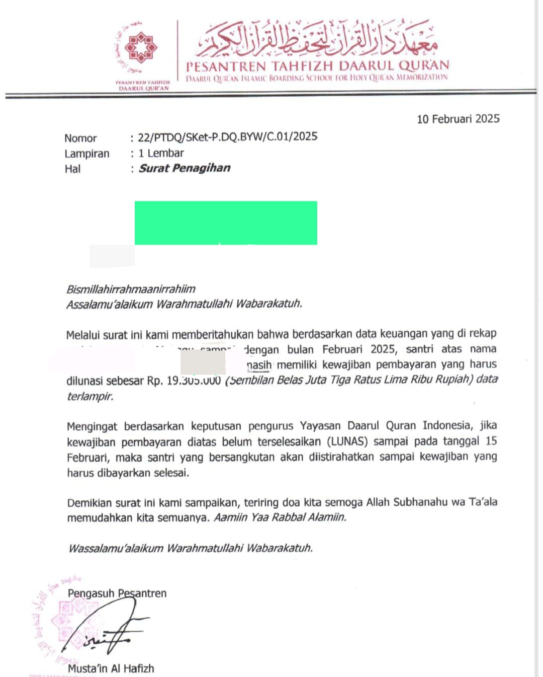 Banyuwangi, 17 April 2025 – Seorang wali murid dari Pesantren Tahfizh Daarul Qur’an menyampaikan kekecewaan mendalam atas terbitnya surat penagihan resmi dari pihak pesantren tertanggal 10 Februari 2025. Surat tersebut menegaskan bahwa santri berinisial M.Y. masih memiliki tunggakan dan mengultimatum agar pelunasan dilakukan tanggal 15 Februari 2025, jika tidak maka santri akan “diistirahatkan” sampai pihak wali murid melunasi.