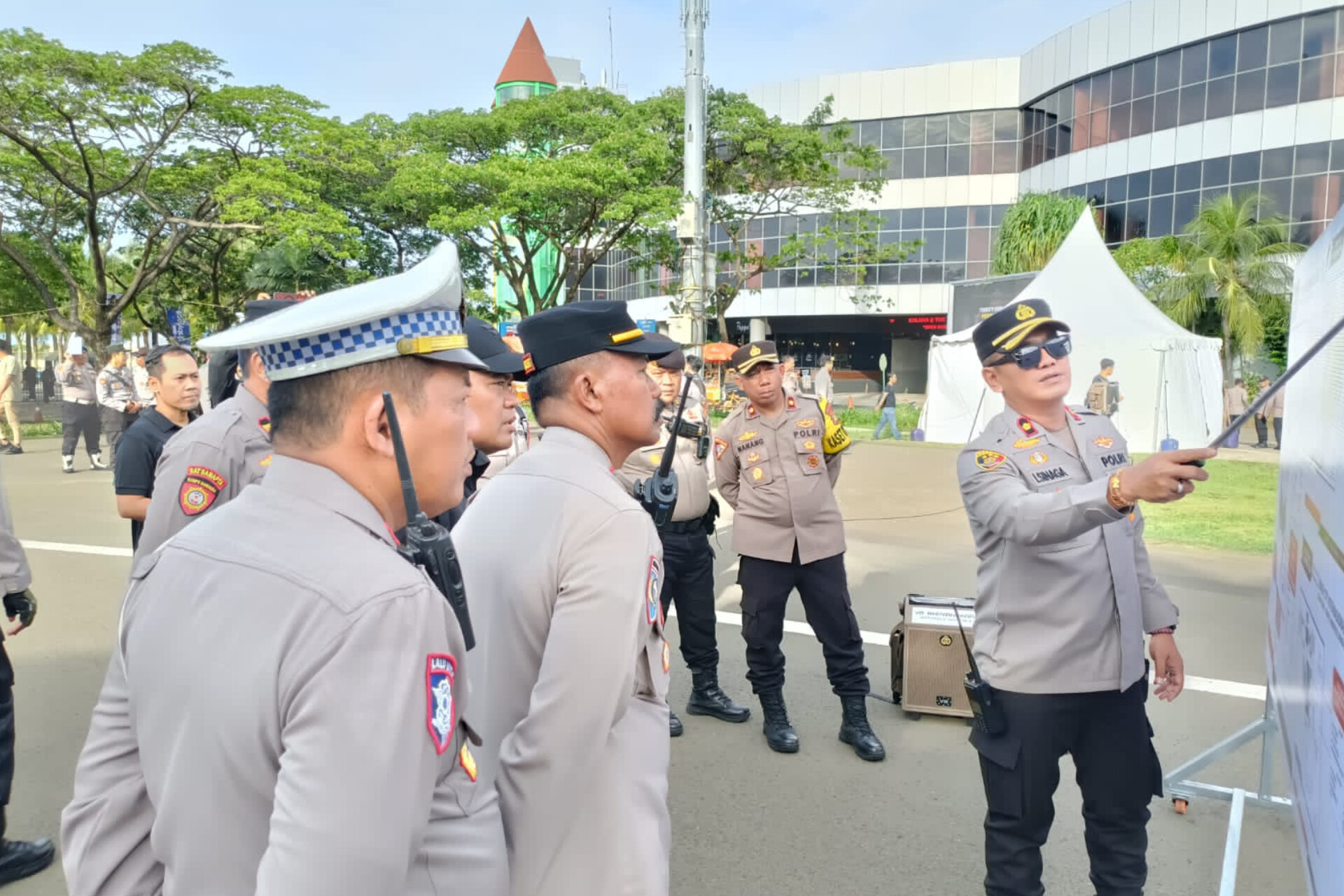 Usai apel, petugas melakukan Tactical Wall Game (TWG) guna memantapkan kesiapan pengamanan dan pembagian ploting tugas di area konser.