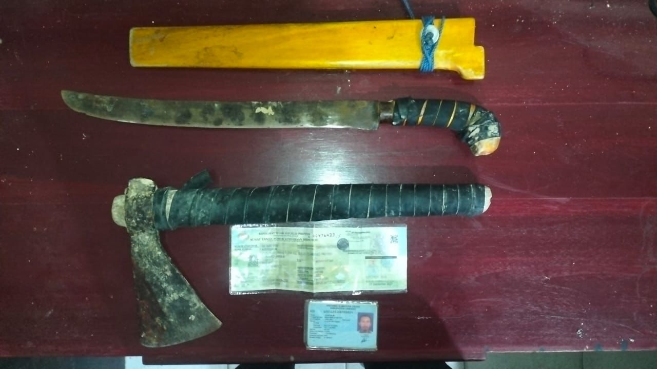 Dalam pengungkapan kasus tersebut, petugas turut mengamankan sejumlah barang bukti berupa senjata tajam, antara lain kapak, parang, dan egrek, serta pakaian yang dikenakan pelaku dan satu unit sepeda motor. Motif kejadian diduga dipicu oleh permasalahan pribadi antara pelaku dengan mantan istrinya terkait pembagian harta bersama.