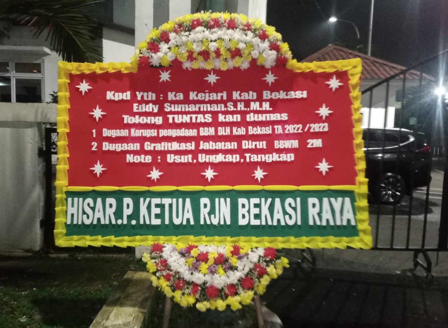 Tulisan dalam papan bunga itu memuat desakan agar Kejari segera menuntaskan dua laporan penting dugaan tindak pidana korupsi dan gratifikasi jabatan di lingkungan Pemerintah Kabupaten Bekasi.