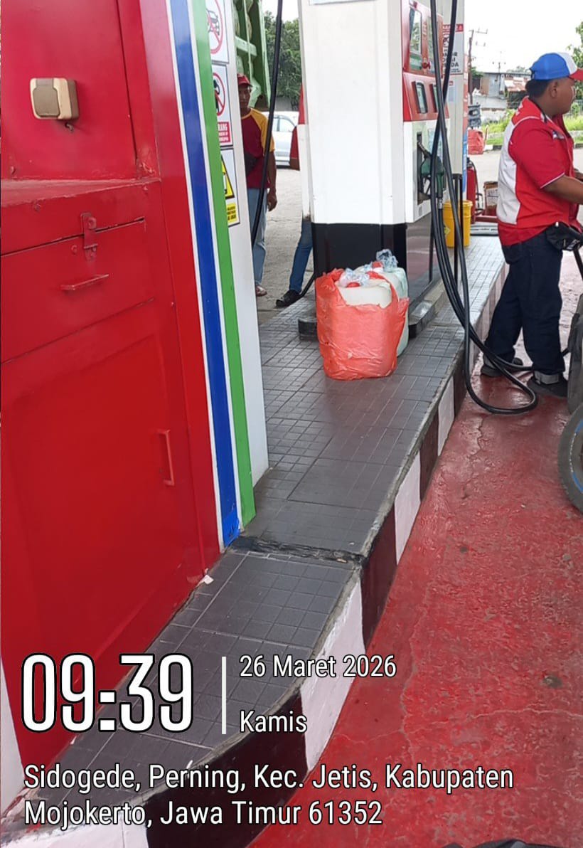 Sidikpolisi.News.id Mojokerto – Praktik penjualan bahan bakar minyak (BBM) jenis Pertamax menggunakan dua jurigen plastik di SPBU wilayah Perning menuai sorotan tajam kamis 26/03/2026.