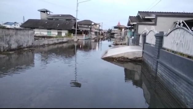 Pasalnya,sudah beberapa hari ini kondisi pasang Air rob dengan ketinggian mencapai Sepinggang orang dewasa lebih kurang satu meter sehingga mengakibatkan jalan dan Rumah warga tenggelam.
